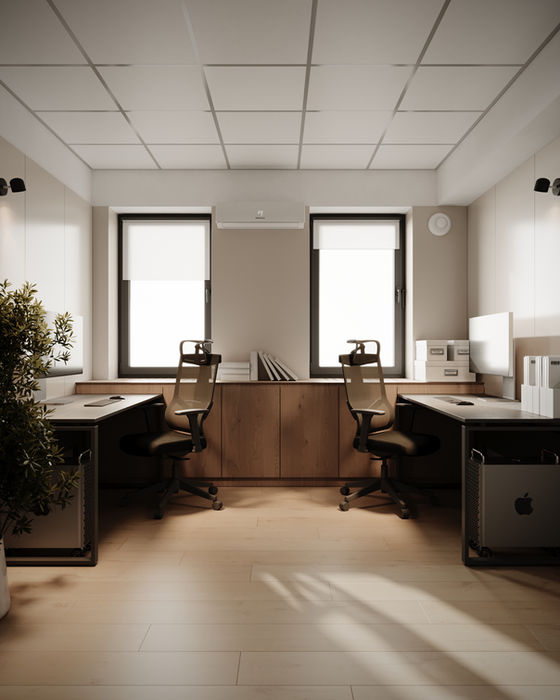 Nell'ufficio è presente un'area d'ingresso con zona di attesa, una macchinetta del caffè e un frigo. Ci sono un ufficio per l'assistente del direttore e l'ufficio del direttore stesso, dotato di un grande tavolo per le riunioni. È previsto un ufficio per quattro specialisti IT, un ufficio per due contabili e una sala riunioni con proiettore.
